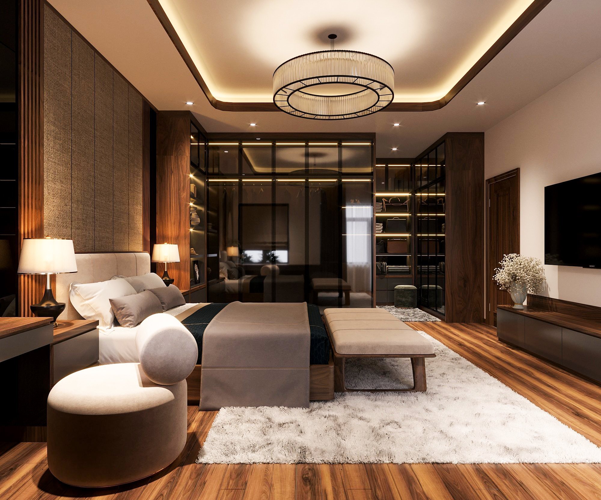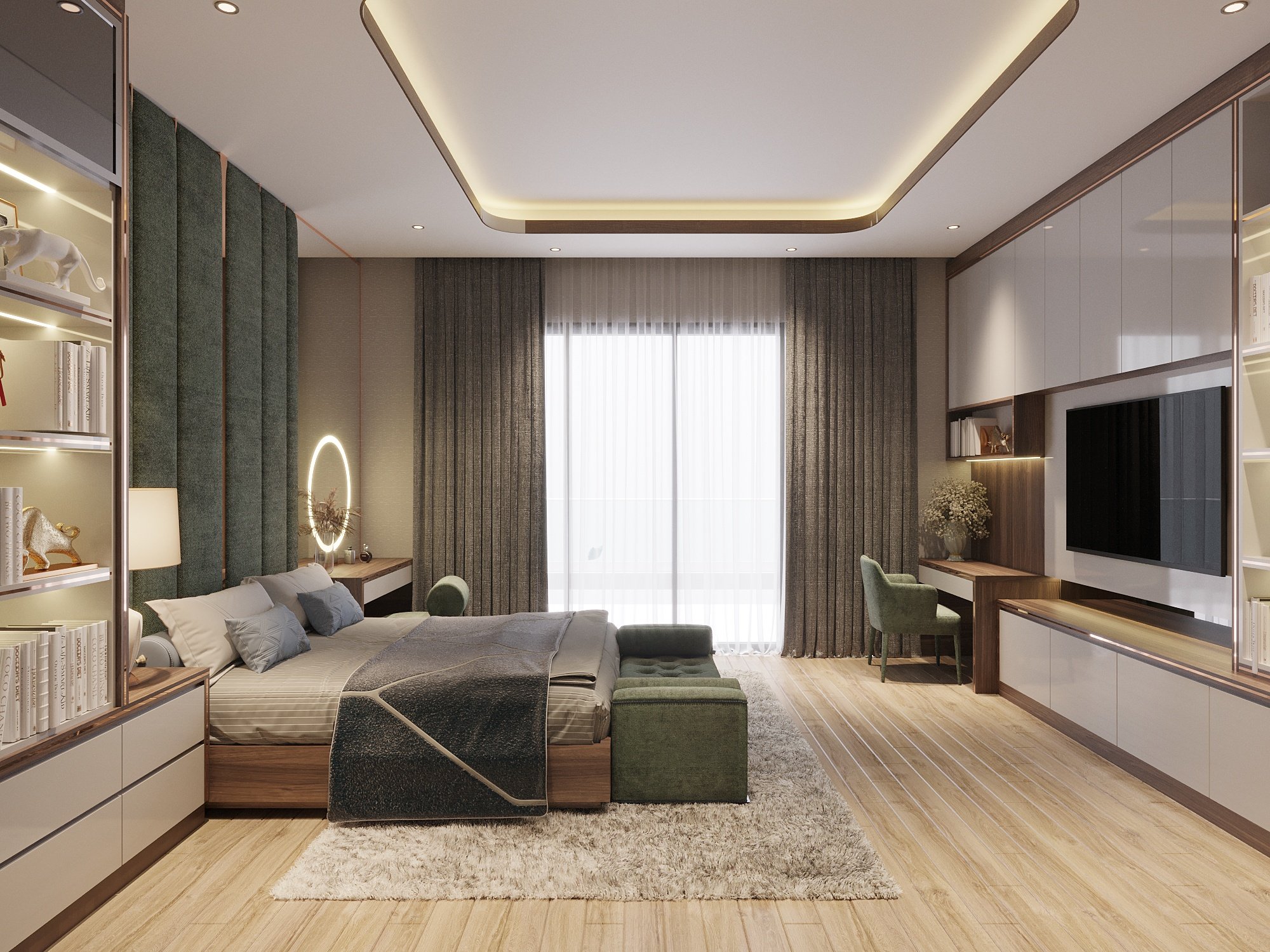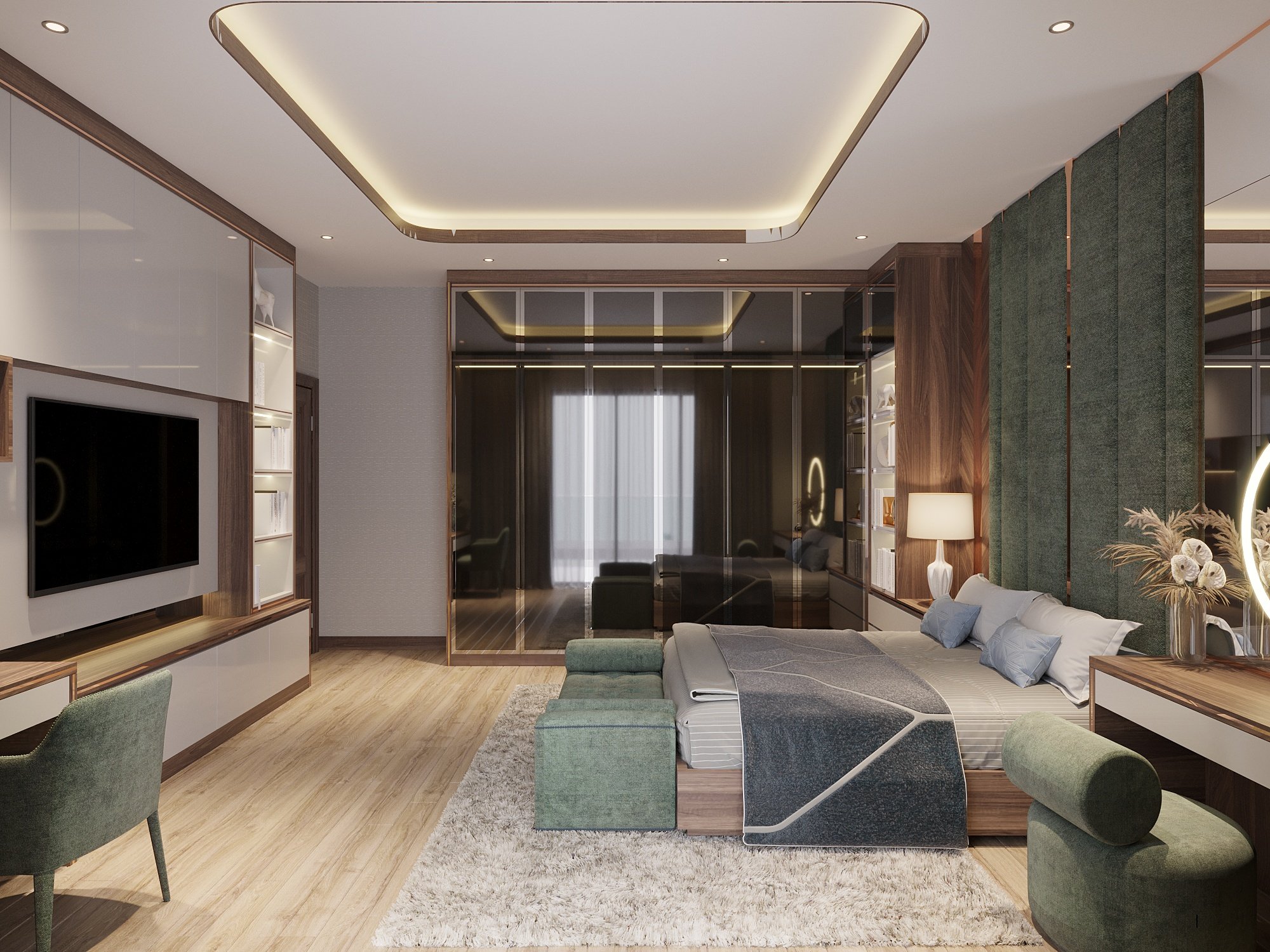 Thiết kế phòng ngủ hai phong cách khác biệt, đáp ứng nhu cầu thẩm mỹ riêng của thành viên trong gia đình. Phòng ngủ lớn với nội thất chủ đạo là gỗ mang lại cảm giác ấm áp, đẳng cấp dành cho bố mẹ. Phòng còn lại mang phong cách đại, tươi sáng hơn, phù hợp với giới trẻ.