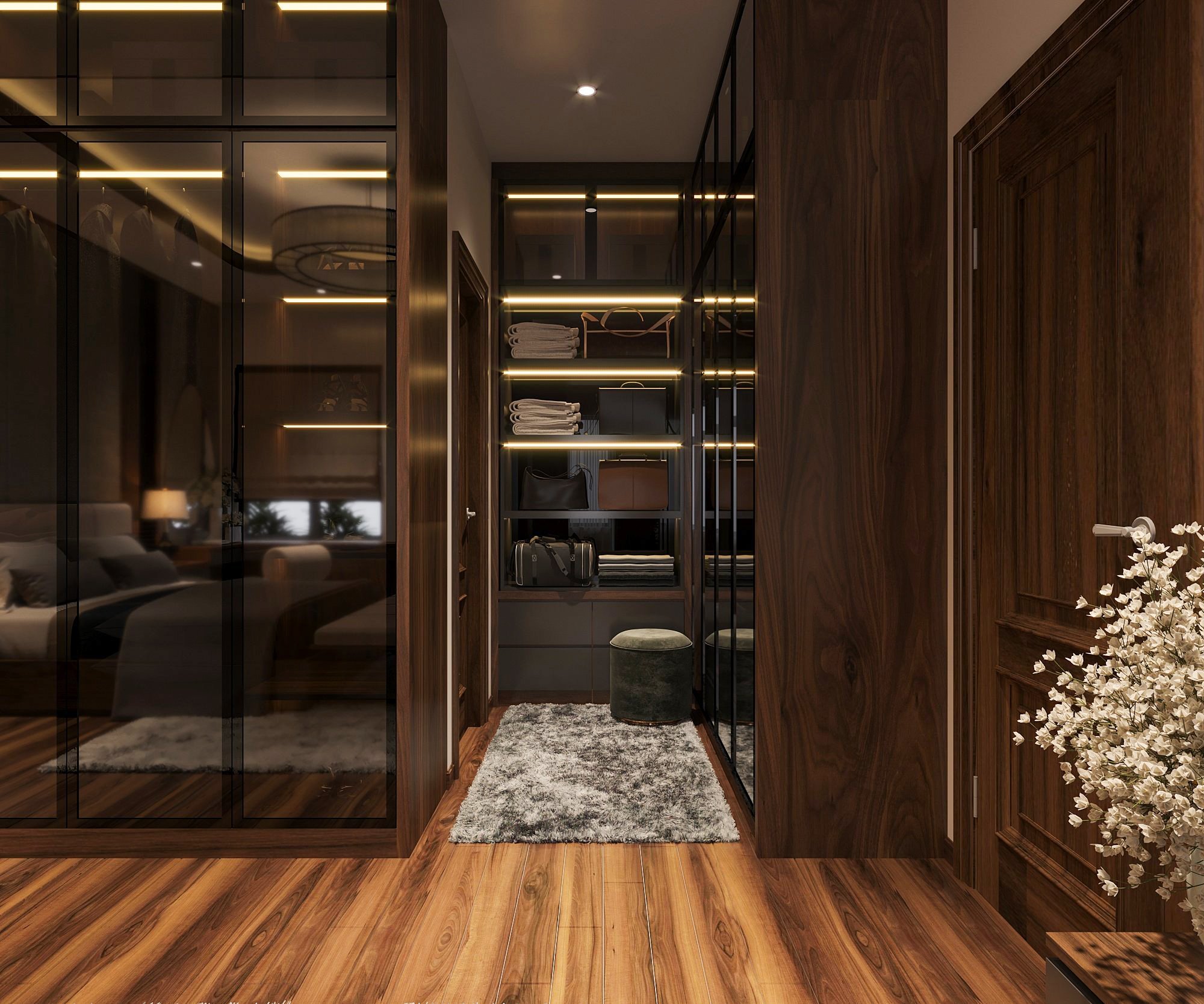 Dự án thiết kế nội thất nhà phố 3 tầng tại Long An thể hiện sự kết hợp hài hòa giữa chất liệu gỗ óc chó tự nhiên và gỗ công nghiệp MDF cao cấp, mang đến không gian sống sang trọng, đẳng cấp và bền vững theo thời gian.
