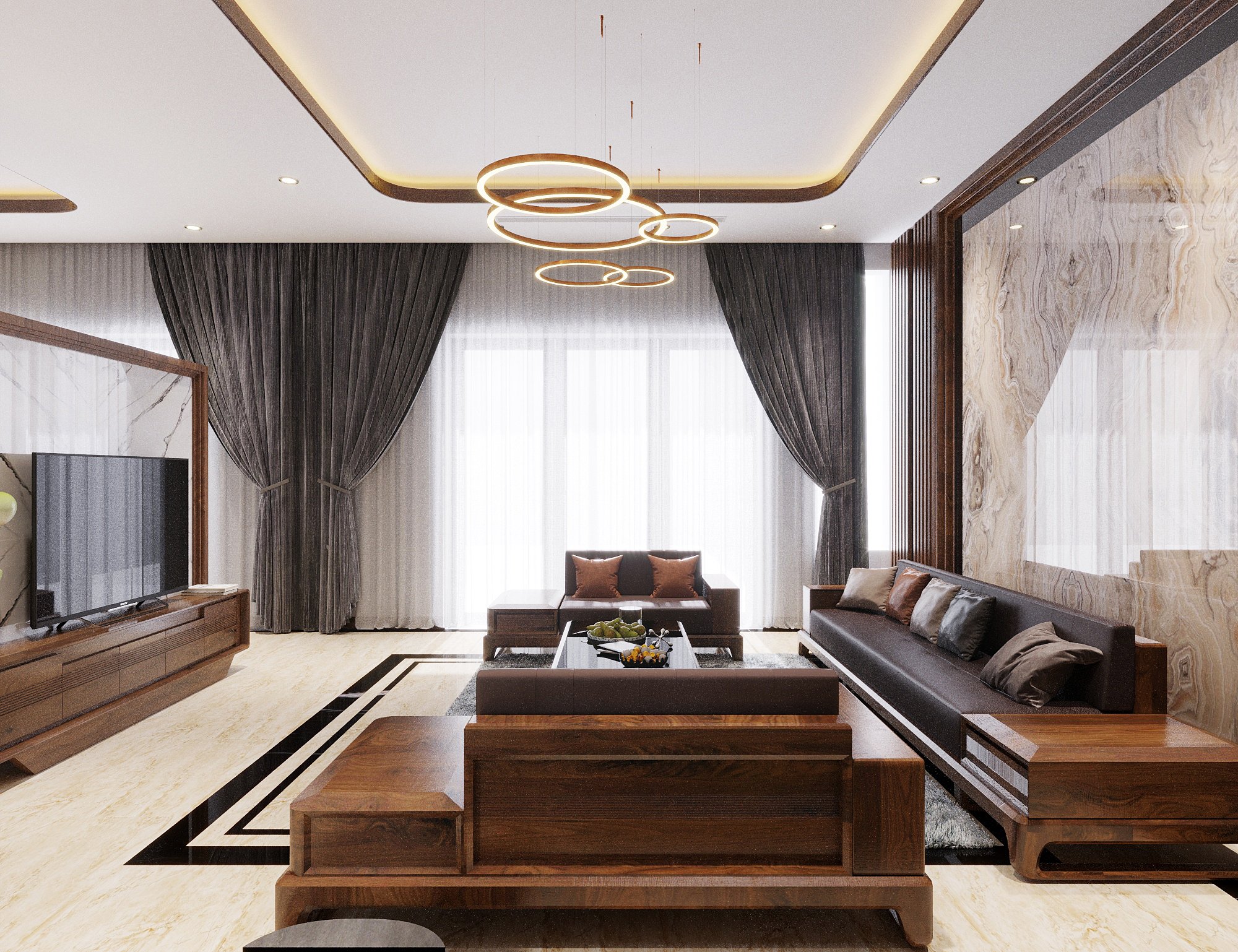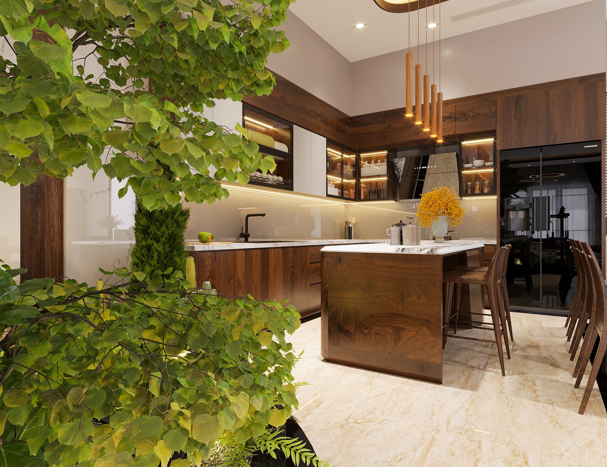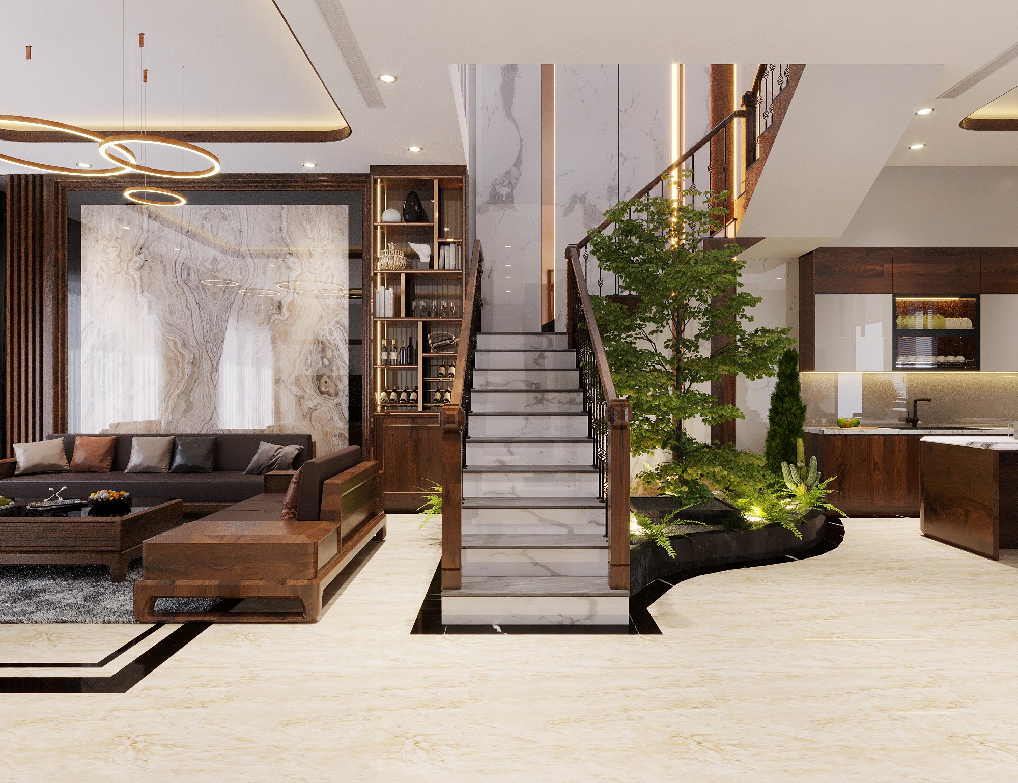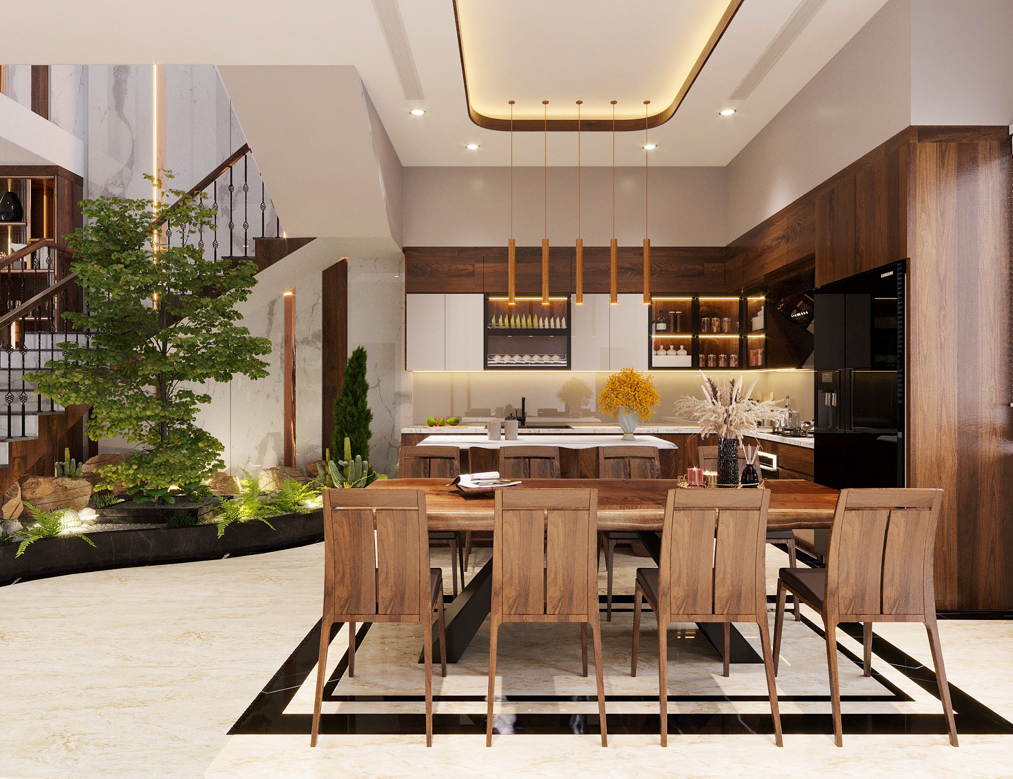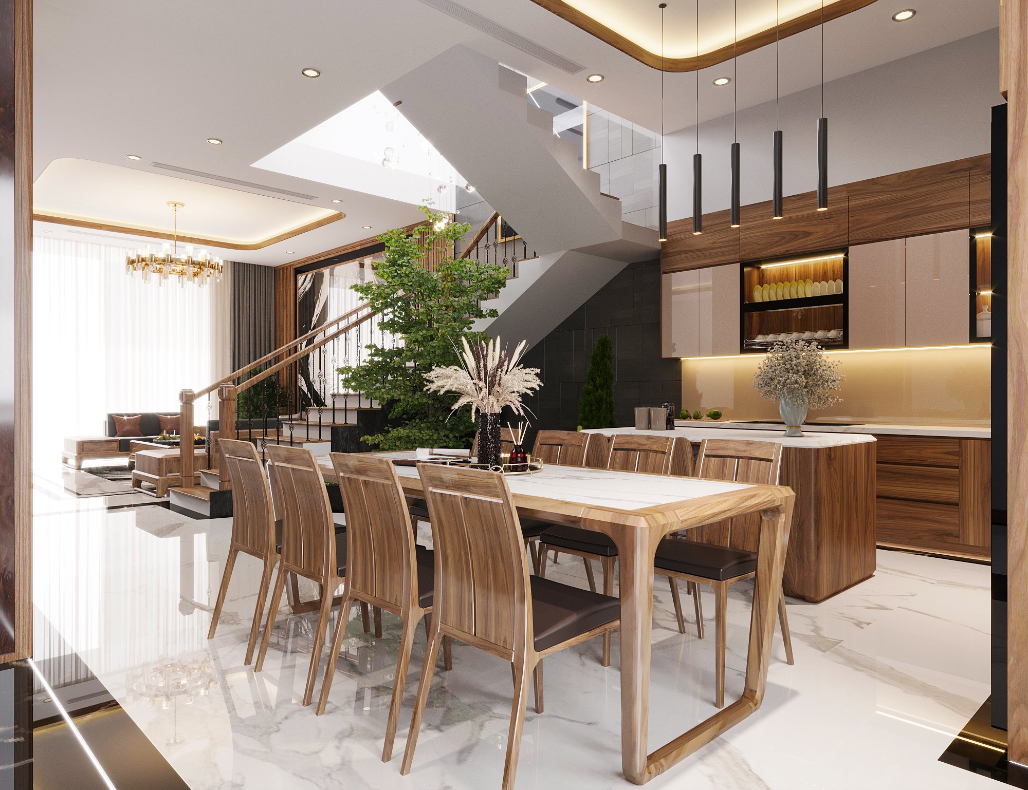Gỗ óc chó tự nhiên – biểu tượng của sự bền vững và giá trị truyền thống – được Homy Decor ứng dụng trong không gian phòng khách, phòng ăn và khu bếp, tạo nên vẻ đẹp mộc mạc nhưng đầy sang trọng. Cùng với đó, cây xanh trang trí và hệ cửa kính lớn mang ánh sáng tự nhiên tràn đầy không gian, làm nổi bật màu gỗ và mang lại cảm giác thoải mái, dễ chịu.