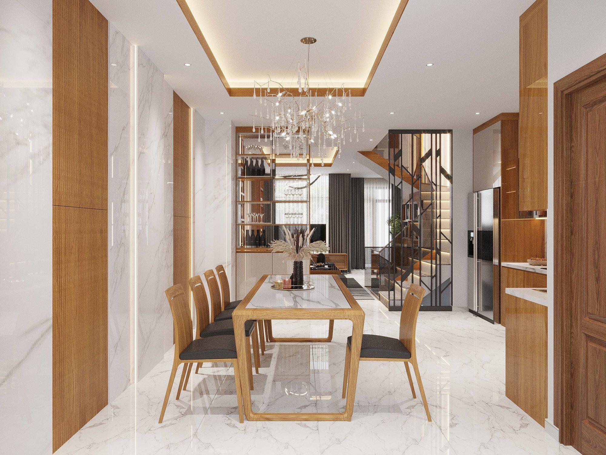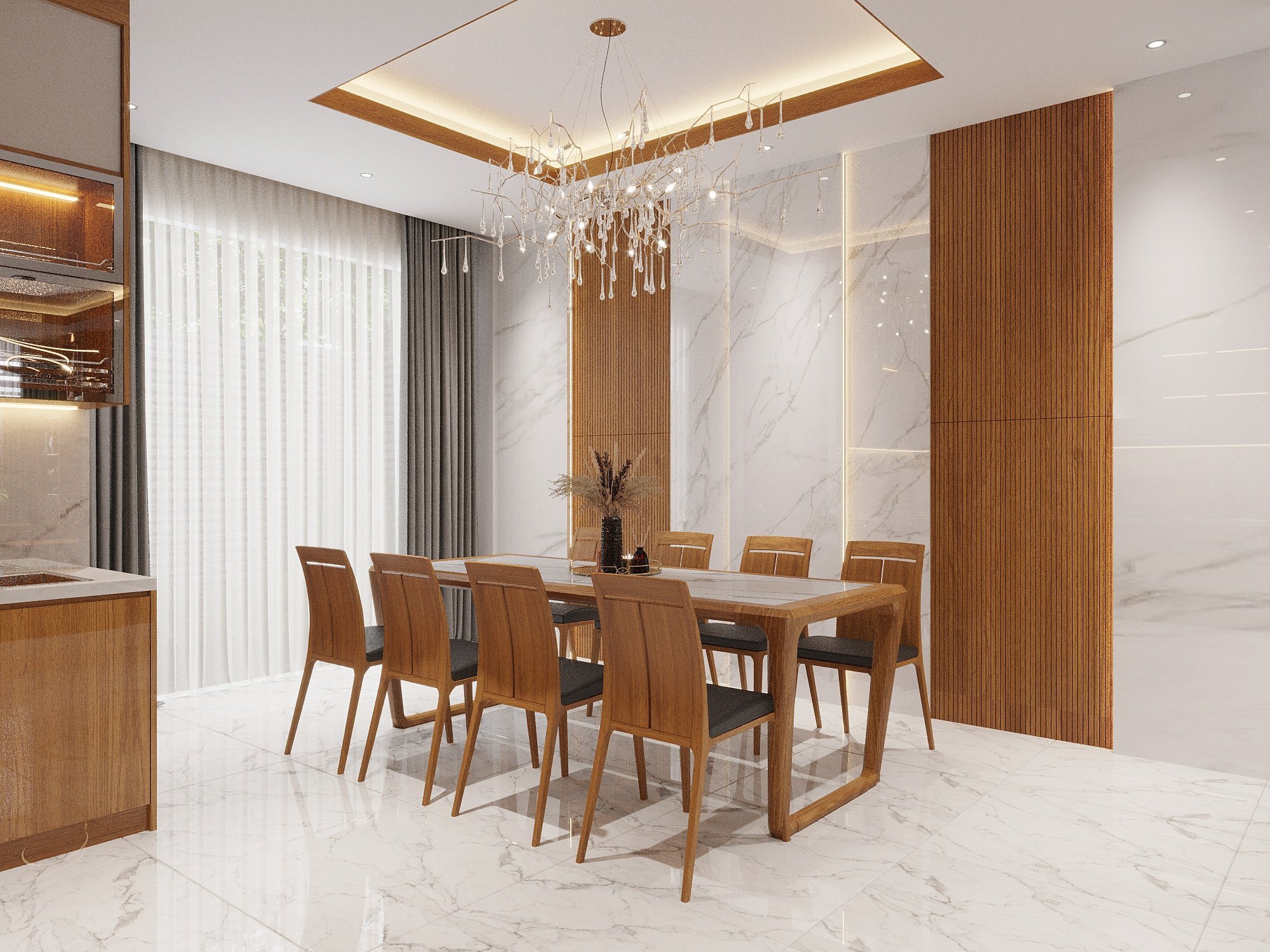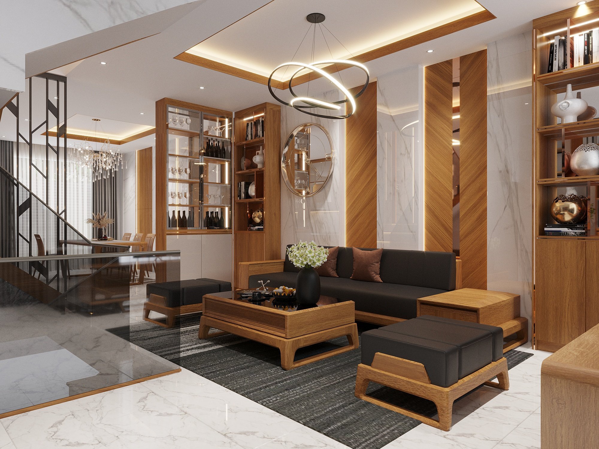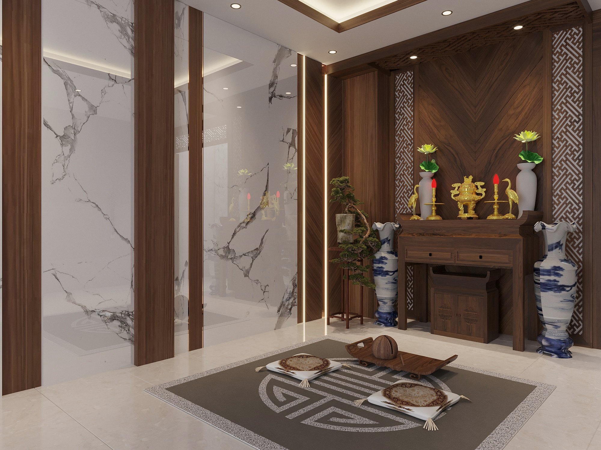 Khu vực phòng thờ, phòng khách và phòng ăn sử dụng gỗ tự nhiên làm chủ đạo – từ hệ tủ, bàn ghế đến vách ốp tường – tạo cảm giác sang trọng, gần gũi và thể hiện gu thẩm mỹ riêng của gia chủ. Vân gỗ mềm mại cùng màu gỗ truyền thống giúp không gian trở nên ấm áp, thể hiện sự chỉn chu trong từng chi tiết.