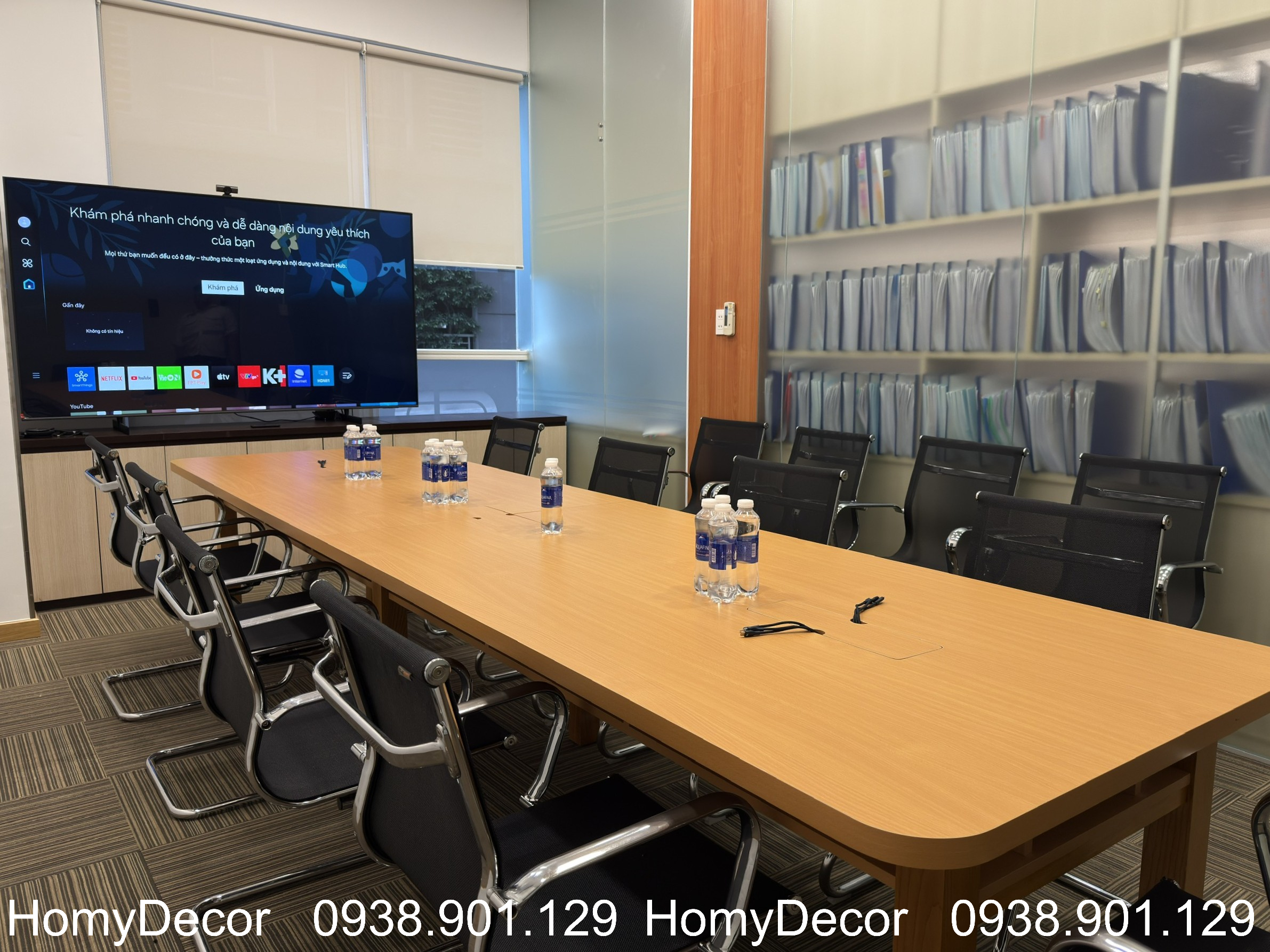 Toàn bộ bàn làm việc, bàn họp và hệ tủ lưu trữ kịch trần đều được sử dụng gỗ công nghiệp MDF chất lượng cao. Với ưu điểm bề mặt phẳng mịn, độ bền cao, khả năng chống cong vênh và mối mọt tốt, MDF là vật liệu lý tưởng cho môi trường làm việc cần tính thẩm mỹ và độ ổn định lâu dài.